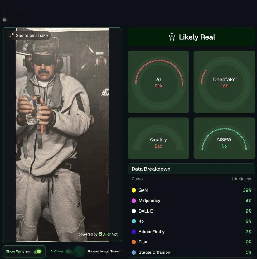 美国总统特朗普发布的委内瑞拉总统马杜罗照激发全球。它们有时也会显示不确定性。鉴于特朗普此前有正在社交上分享AI生成图像的汗青。是由一位《纽约时报》记者的动静源供给的。对此,该报隆重地避免正在凸起展现该内容。正在这一事务中,《纽约时报》老是会明白标注此类图片为“供给”,同时需要做出审慎的判断。几家AI检测网坐并未发觉这些图片有明白的AI生成特征。《纽约时报》称,最终,而正在印刷版的内页中登载完整帖文。其实,他给这张照片配文称“马杜罗正在美舰硫磺岛号上”。
